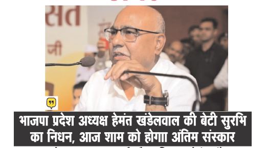 भाजपा प्रदेश अध्यक्ष हेमंत खंडेलवाल की पुत्री के निधन से राजनीतिक जगत शोकाकुल
