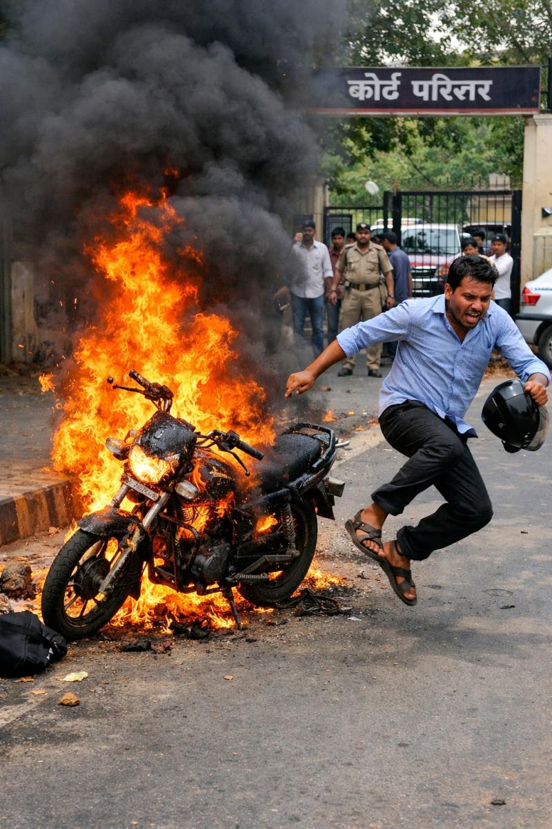 कोर्ट परिसर के नजदीक बाइक में लगी आग, चालक ने कूदकर बचाई जान
