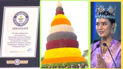 हैदराबाद में 63 फीट ऊंचा विशाल 'बटुकम्मा', दो गिनीज वर्ल्ड रिकॉर्ड अपने नाम किए, मिस वर्ल्ड बोलीं, 'इट्स अ स्पेशल मोमेंट'